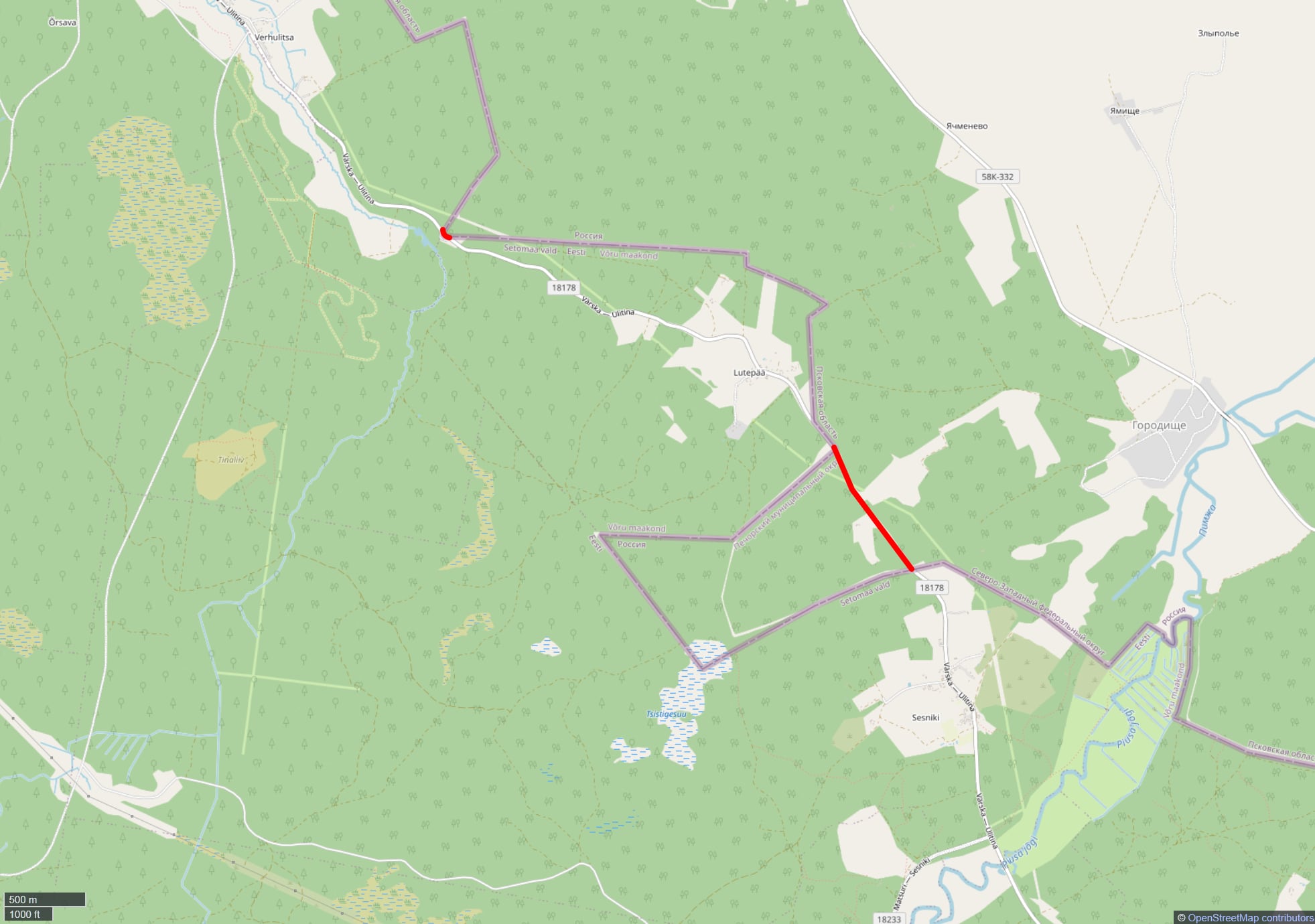 Крупная карта участка «Saatse Boot» на границе Эстонии с Россией, с закрытой короткой дорогой, отмеченной красным цветом
